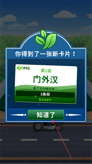 4、完成割草任务后,获得新卡片内外汉,点击知道了继续游戏,积累卡片升级。
