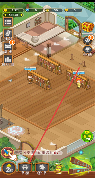 1、进入游戏图书馆场景,点击箭头指向的书屋按钮,进入书屋。
