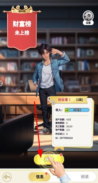 4、个人信息界面,点击升级提升创业者等级,提升后能解锁更多经营权限,还可查看资产总额等经营数据,跟进发展进度。