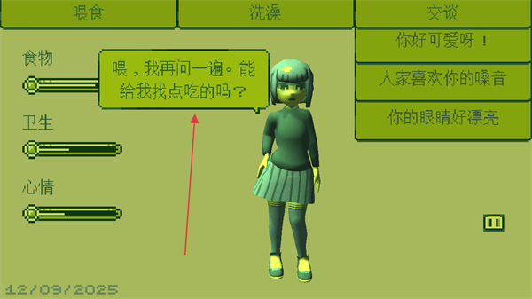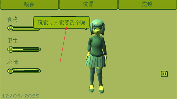 4、持续关注女孩的需求,对应操作洗澡交谈,维持她的食物、卫生、心情进度条,推进互动流程。