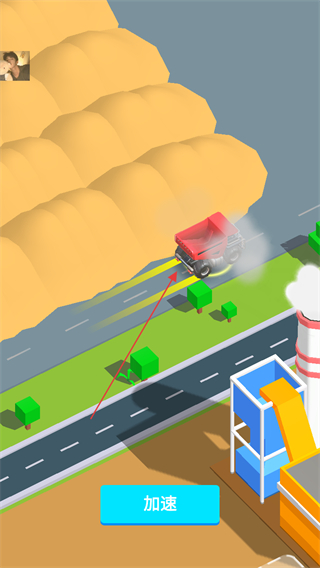 2、驾驶卡车运输沙土,点击加速按钮提升行驶速度,高效运输。