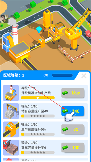 1、花费金币升级挖掘机,如提升工作速度,增加区域等级进度。
