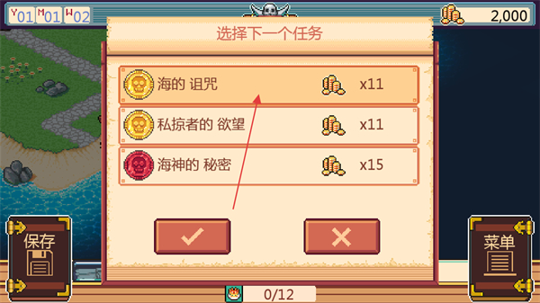 采用复古像素画风构建海盗场景,船只、岛屿、怪兽造型充满特色,色彩搭配鲜明,营造独特的海盗冒险氛围。