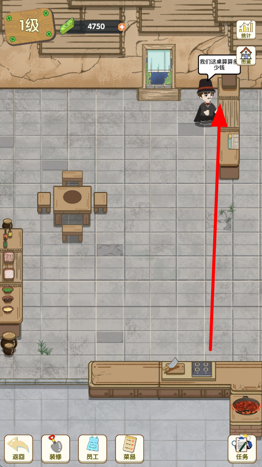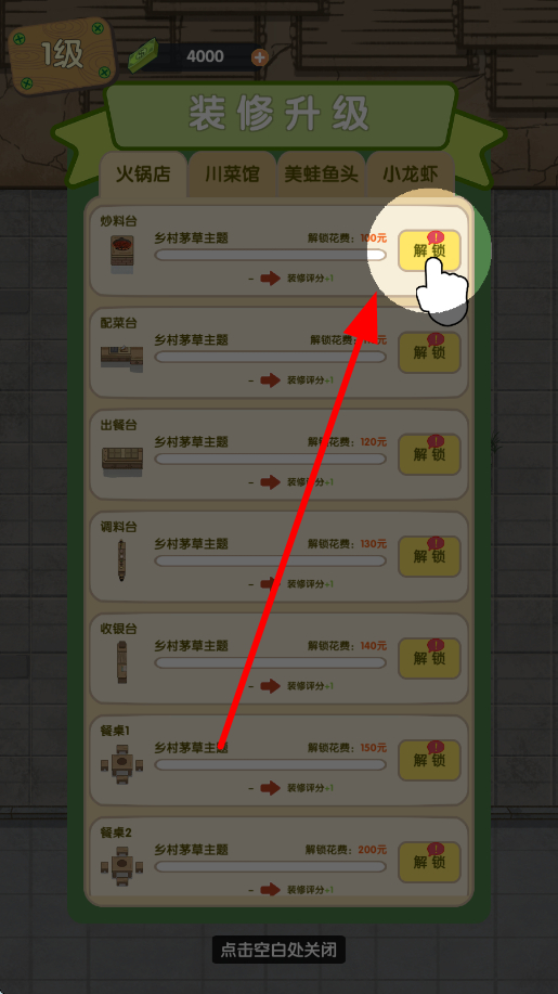 2、接着进入装修升级界面,可对火锅店的炒料台、配菜台等各类设施进行解锁,花费对应资金,提升店铺的装修与设施水平。