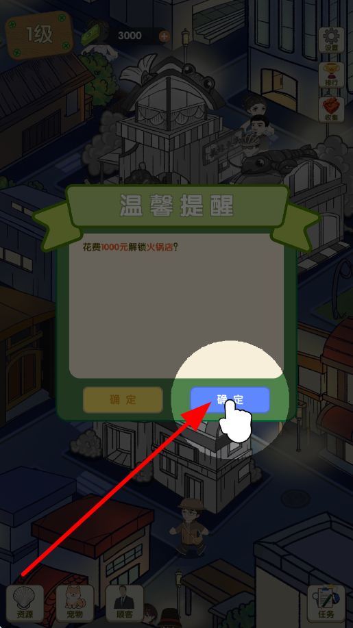 1、玩家开局首先在游戏中,当出现解锁火锅店的温馨提醒时,花费相应资金,点击确定,解锁火锅店,开启店铺经营的第一步。