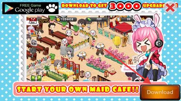 1、首先看界面有Googleplay是应用商店,中间呈现了宣传语STARTYOUROWNMAIDCAFE!!所以游戏是经营女仆咖啡厅。