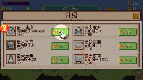 4、进入升级界面,消耗25金币提升最大速度属性,增强火车行驶能力,优化行程效率。