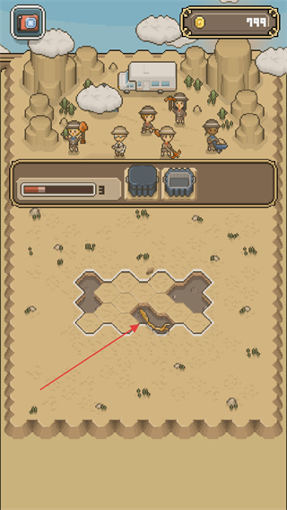1、在挖掘场景中,点击上方的道具按钮,准备使用挖掘道具。