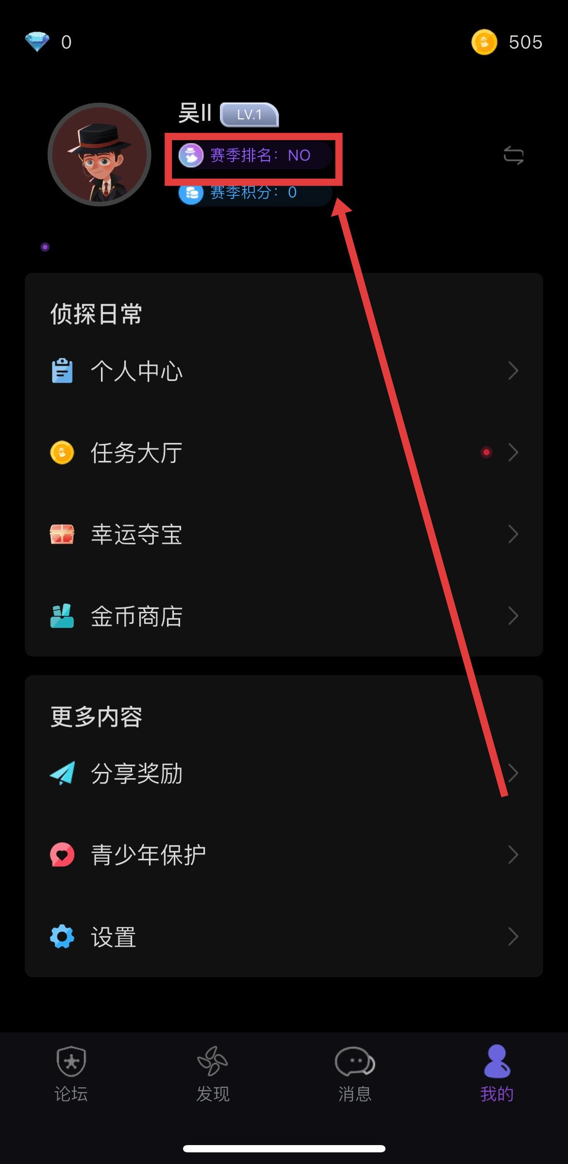 2、进入我的页面后,找到位于昵称下方的字体较小区域赛季排名并点击,即可进入排名查询入口。