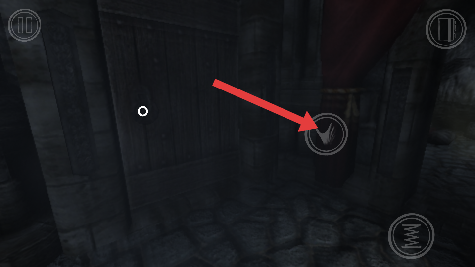 1、在密室场景中,遇到箭头指向的交互按键手掌图标时,点击该按键,可尝试与周围物品或门进行交互,推进探索进程。