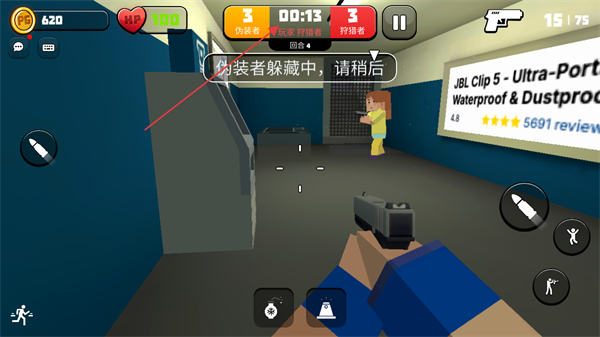 1、伪装者隐藏阶段等待后,以猎人身份在场景内搜寻目标,准备攻击。