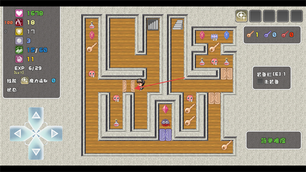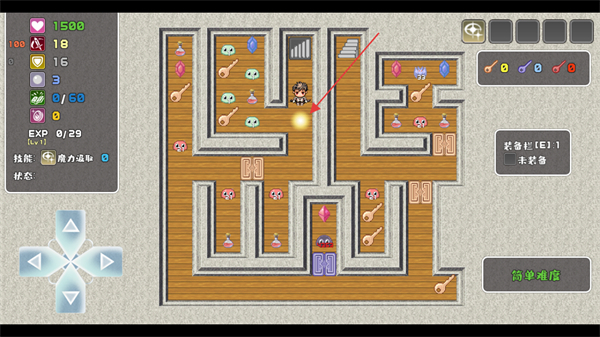 1、操控摇杆移动角色,在迷宫区域探索,收集钥匙等道具,推进流程。
