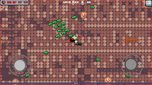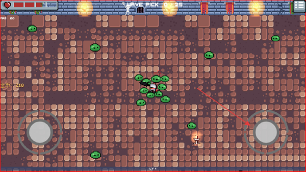 1、操控左侧移动摇杆控制角色移动,右侧摇杆控制攻击方向,在地牢中探索并消灭绿色怪物。