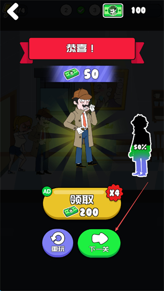 4、通关后可获得金币奖励,点击下一关继续挑战,不断解锁新关卡。