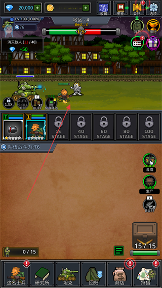 1、在战斗场景中,士兵会自动与敌人交战,通过击败敌人推进关卡,提升区域等级。