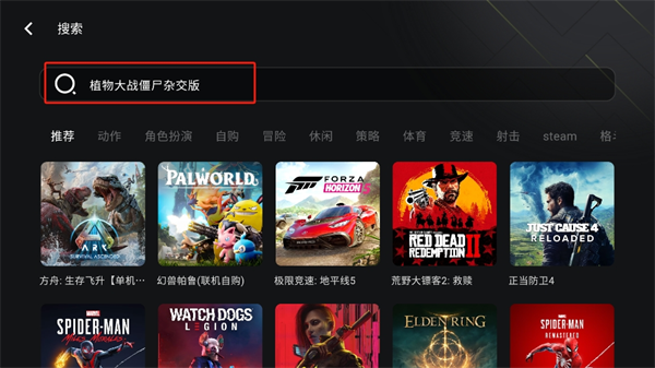 2、在搜索栏中输入我们想要找寻的游戏,以植物大战僵尸杂交版为例;