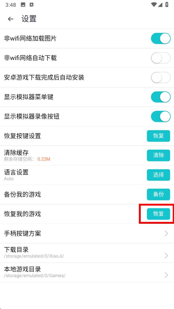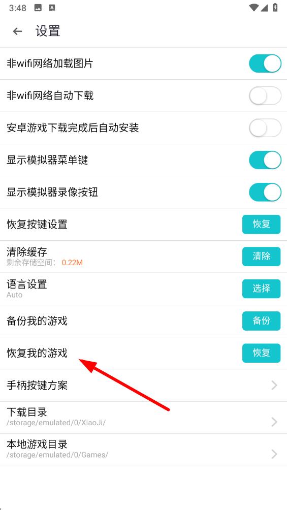 3、在设置界面里,向下滑动页面找到恢复我的游戏的选项。