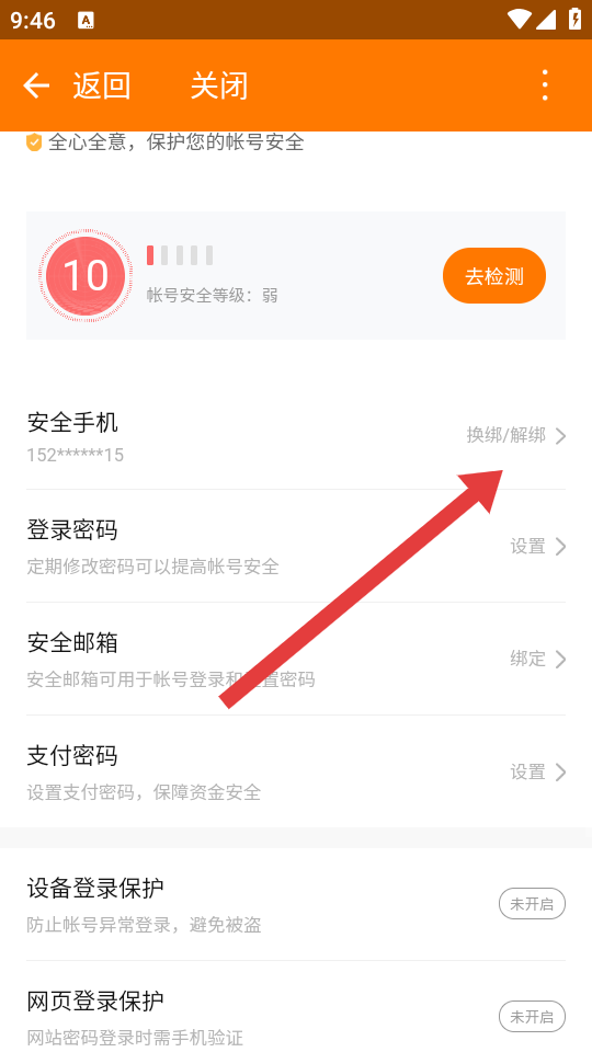 4、在安全设置界面里,找到安全手机选项,点击换绑/解绑,按照后续提示完成手机号解绑操作。
