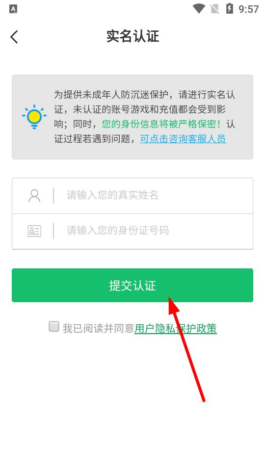 3、进入实名认证页面,依次输入真实姓名和身份证号码,勾选同意用户隐私保护政策后,点击提交认证按钮,完成实名认证。
