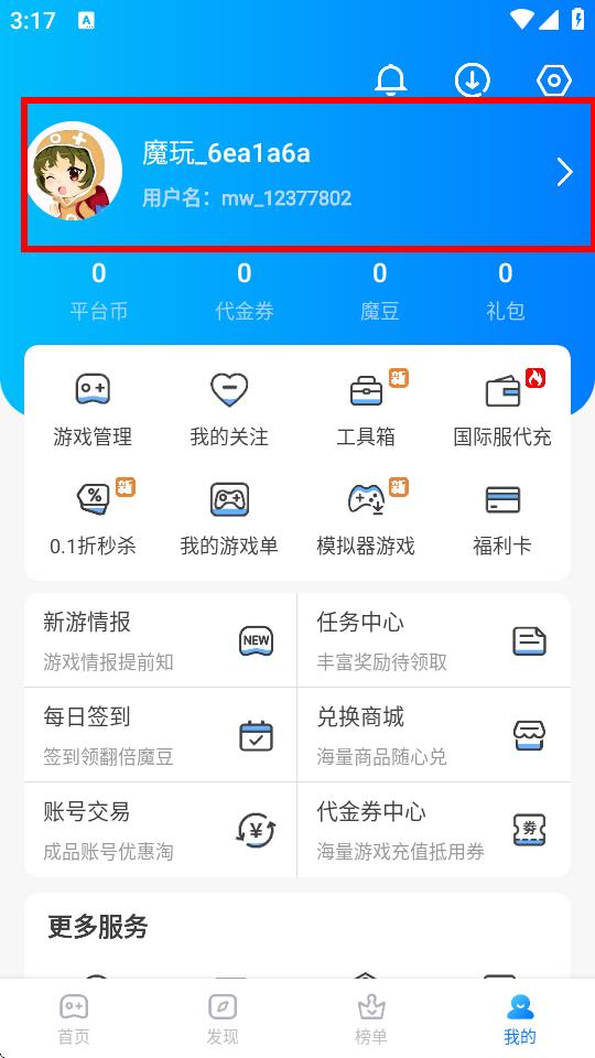 1、打开魔玩助手APP,点击底部导航栏我的,进入个人页面后点击头像及用户名区域。