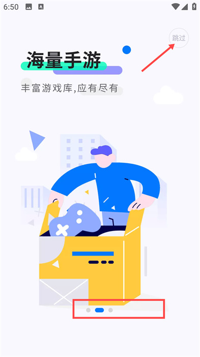2、大家在授权完成之后,软件会呈现一些简单的游戏讲解,通过左右滑动的方式能进行浏览,并且右上角还有【跳过】按钮,可去除当前的海报;