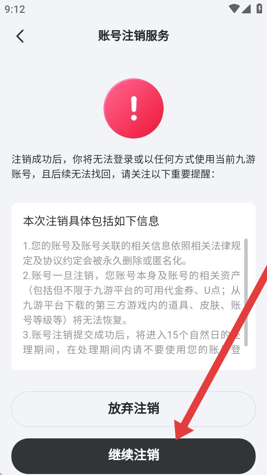 3、在账号注销服务页面里,仔细阅读注销提醒后点击继续注销,后续按提示完成后续验证即可提交注销申请。
