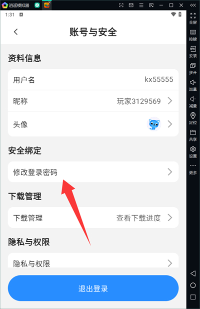 3、之后跳转到账号与安全功能界面,在安全绑定功能界面可以看到有【修改登录密码】选项,点击该选项;