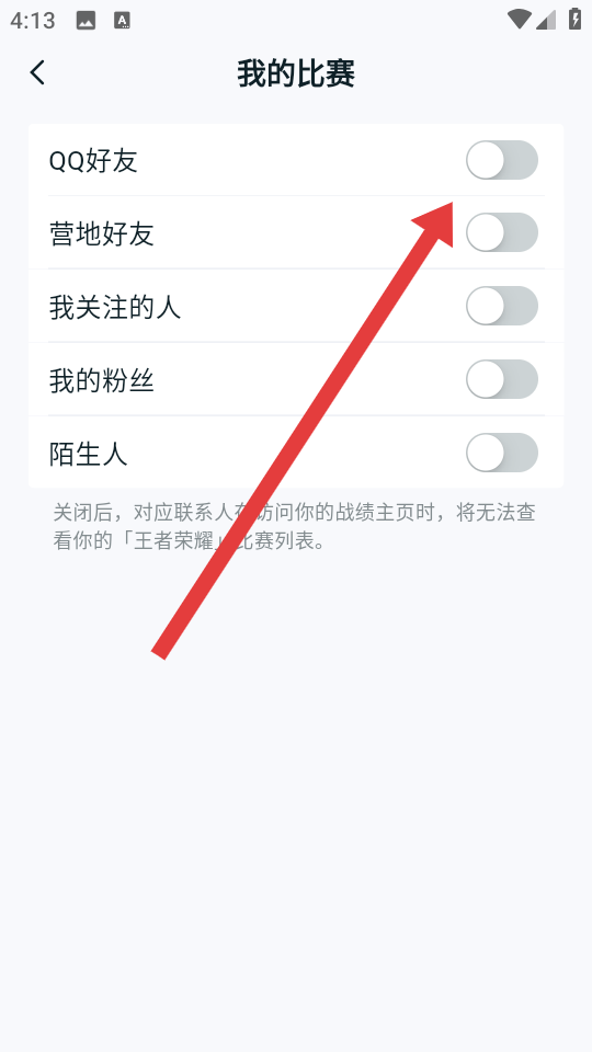3、在我的比赛的页面,将QQ好友、营地好友等所有开关按钮关闭,关闭后对应联系人将无法查看你的比赛战绩。
