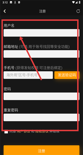 4、在跳转到注册页面后,点击输入框依次填写对应的注册信息,填写好号点击注册按钮,即可完成注册操作。