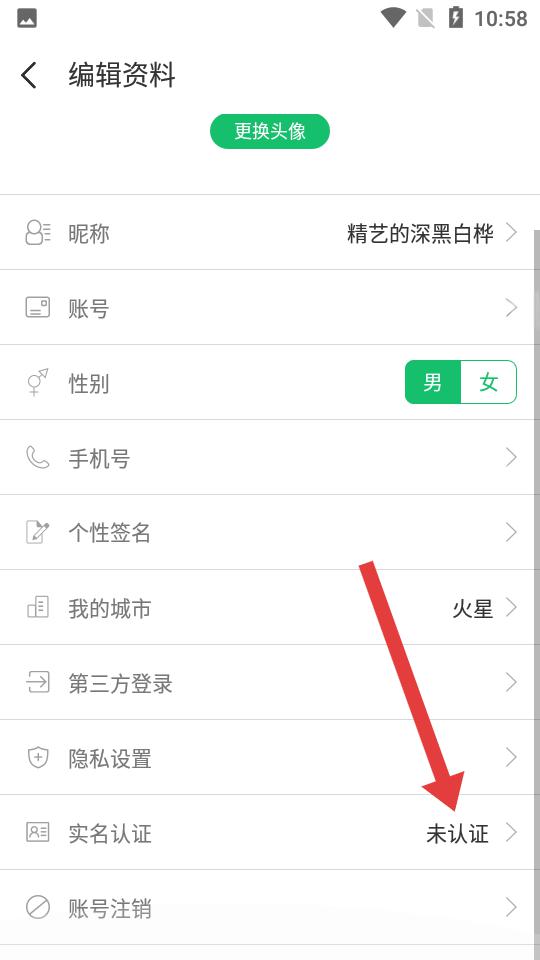 2、点击编辑图标按钮后,进入编辑资料的页面,找到实名认证选项并点击。
