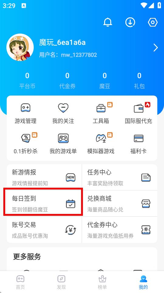 1、打开魔玩助手APP,点击底部我的进入个人页面,在页面中找到每日签到选项并点击。