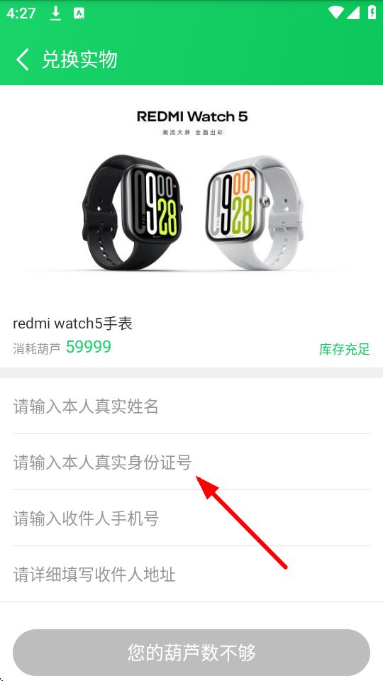 4、若要兑换实物商品,进入对应商品兑换页,如实填写姓名、身份证号、手机号和收件地址等信息进行兑换。