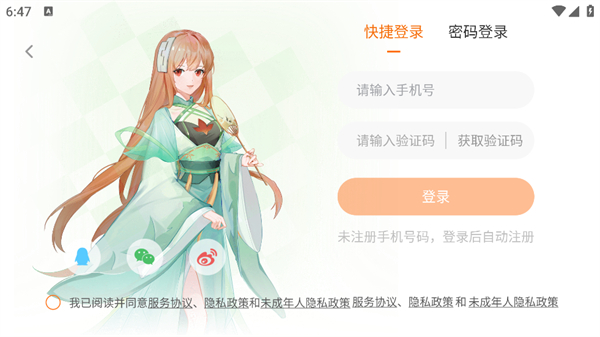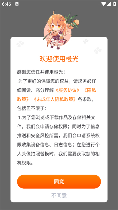 1、打开游戏之后阅读隐私政策和用户协议,点击同意之后就能进入到软件;
