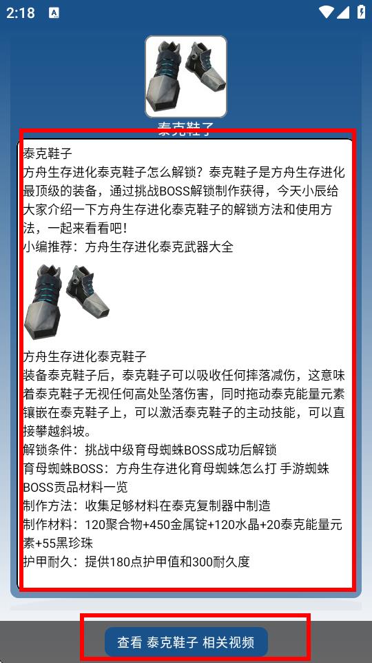 4、点击后会进入该泰克物品的详情页面,能看到关于该物品的详细介绍,包括解锁方法、使用方式、制作材料、护甲耐久等属性信息,还可点击下方按钮查看相关视频。