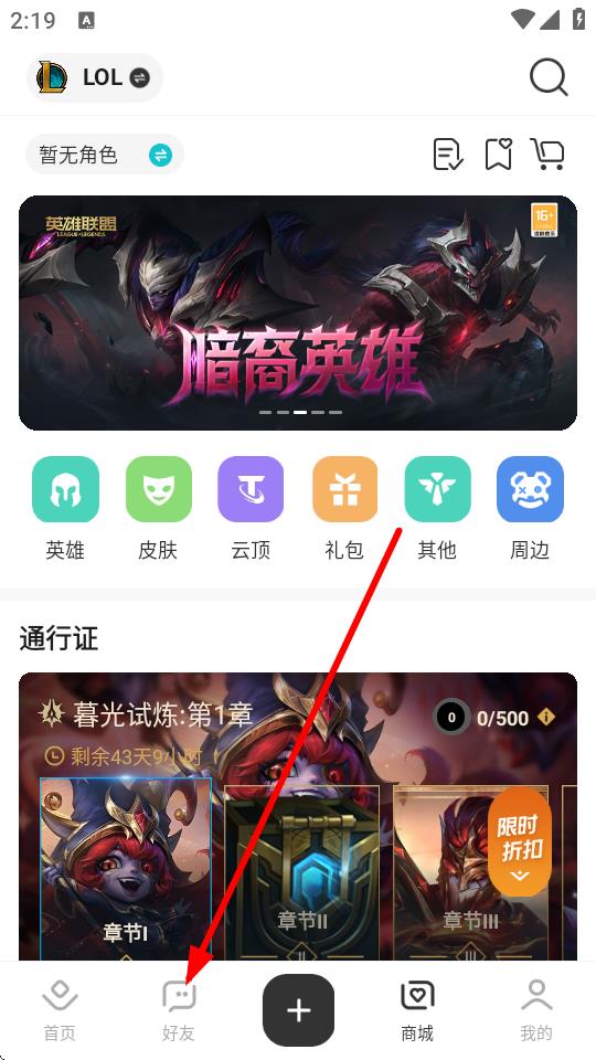 1、打开掌上英雄联盟APP,点击底部导航栏中的好友选项。
