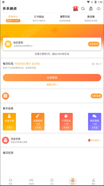 每日完成签到可以获得积分,每日任务完成后可以累积红包,提现秒到账,现金任务多到你难以想象。
