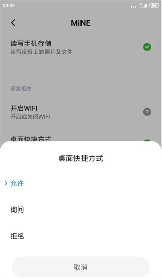 22、接下来介绍创建游戏的快捷方式,在点开扳手进入菜单设置时,底部的播放按钮右边的按钮则是快捷方式按钮,点击即可在桌面创建快捷方式,下次点击快捷方式可以直接进入游戏,当没有创建快捷方式权限时,需要手动设置权限,在系统设置进入应用权限管理给MINE创建的权限