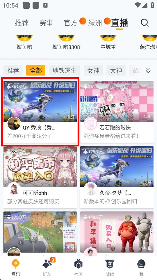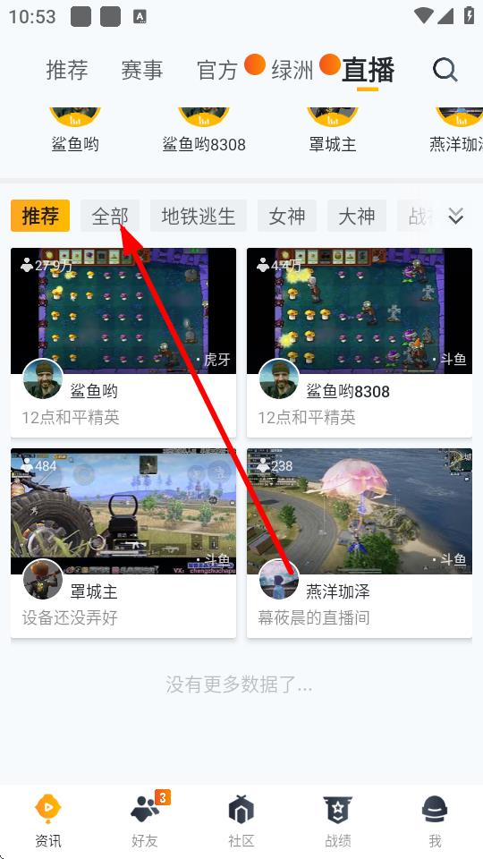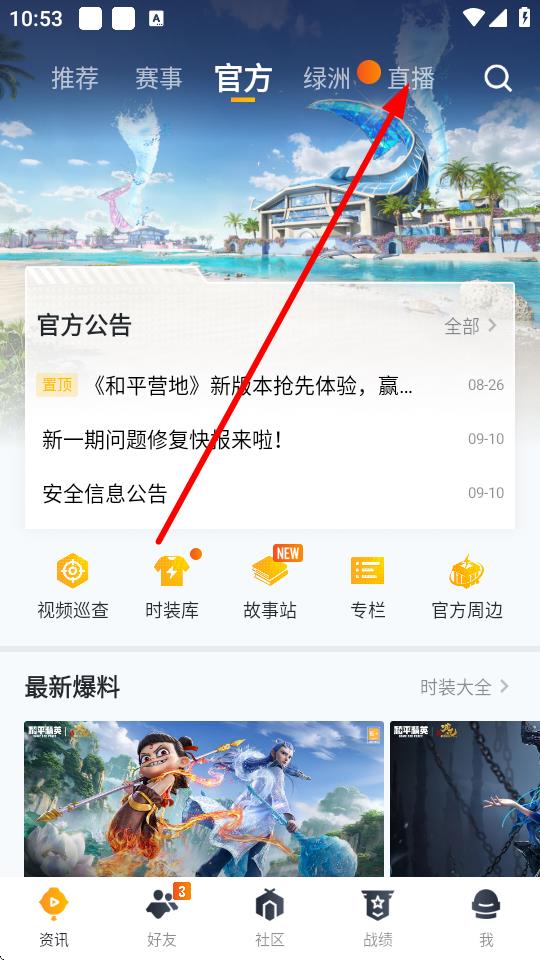 1、打开和平营地APP,点击上方导航栏中的直播选项进入直播页面。