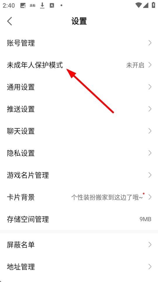 3、在设置界面中,找到并点击未成年人保护模式选项。
