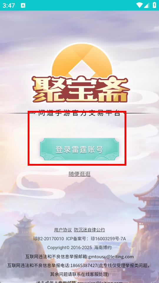 1、打开聚宝斋问道手游官方交易平台,点击登录雷霆账号。