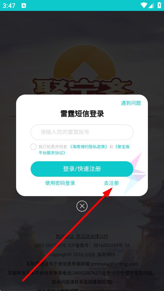 3、进入雷霆短信登录界面,点击右下方去注册选项。