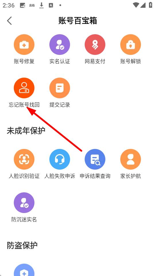 3、进入账号百宝箱页面后,点击忘记账号找回选项。