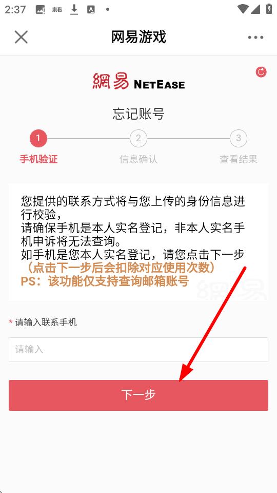 4、在忘记账号页面,按提示输入联系手机后点击下一步,并根据后续指引操作找回账号。