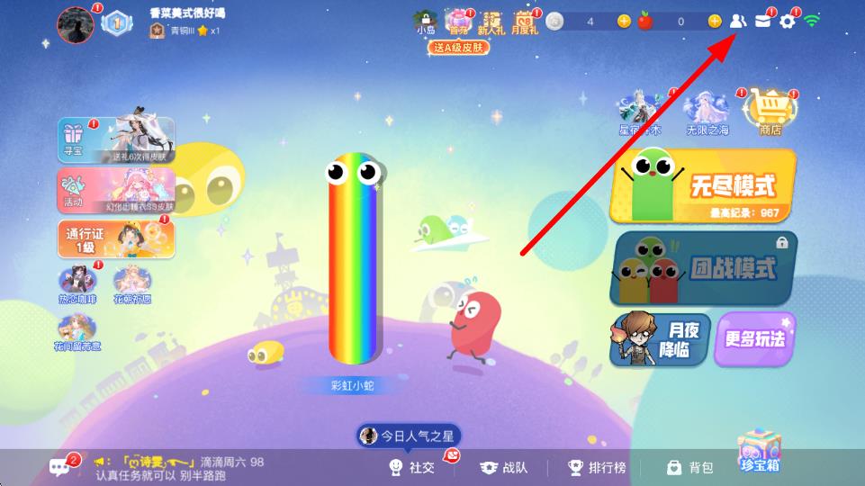 1、打开贪吃蛇大作战游戏,进入游戏主界面后,点击屏幕右上方的好友图标,进入好友相关操作界面。