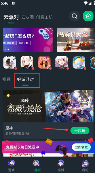 3、在一起来板块中,点击好友派对,就能选择一款游戏点击“一起玩”即可邀请好友一起体验游戏;
