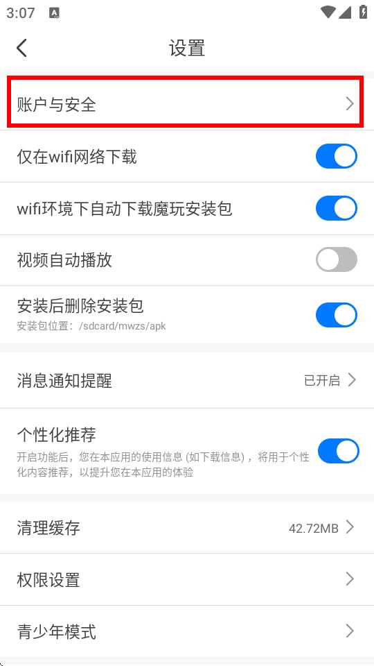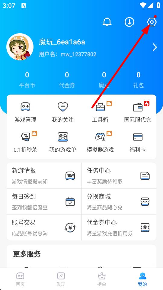 1、打开魔玩助手APP,点击底部导航栏我的进入个人页面,点击右上角设置图标。