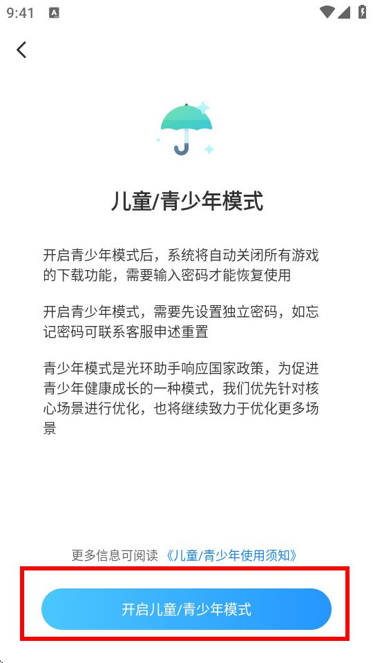 3、进入青少年模式页面后,点击下方开启儿童/青少年模式按钮,按照提示设置密码即可开启。
