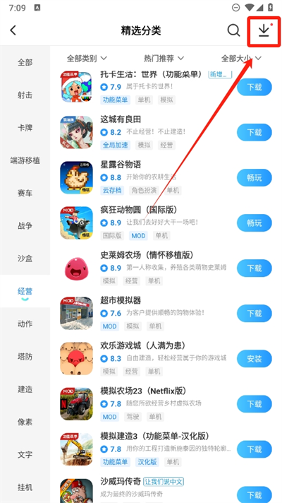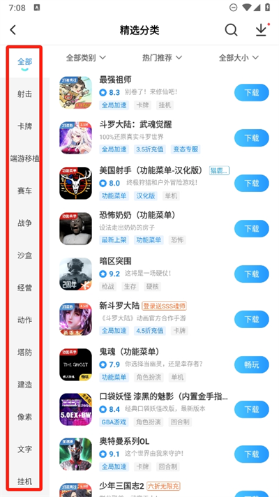 3、进入游戏分类出可以看到有各种精选的游戏分类,根据个人的需求选择不同的游戏类型吧;
