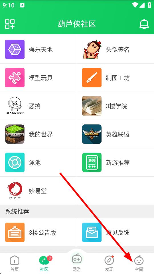 1、打开葫芦侠App,点击底部导航栏中的空间选项进入个人空间页面。