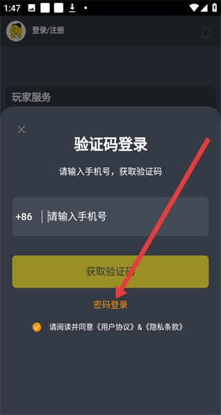 3、在验证码登录页面点击“密码登录”,进入密码登录页面。